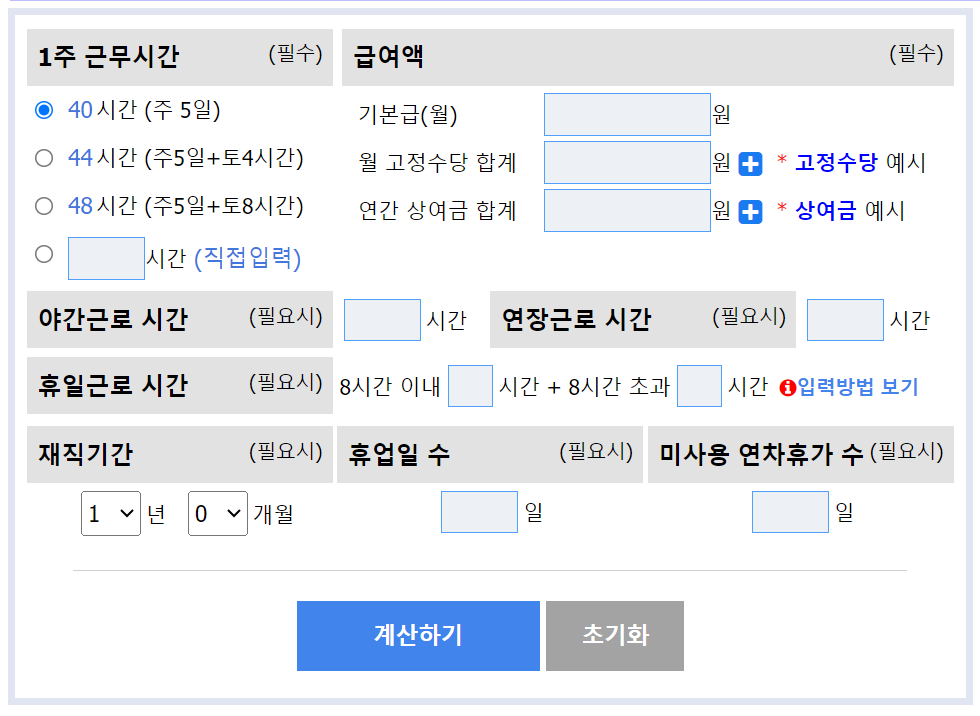 한 주간 근무시간에 맞게 필수에 해당하는 영역을 입력 후 통상임금을 계산해볼 수 있습니다.