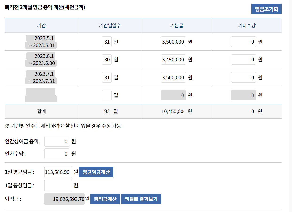 퇴직 전 3개월간의 임금 총액을 계산합니다. 내가 받고있는 기본급과 혹시 기타수당이 있는 경우에는 이도 함께 기입해줍니다.