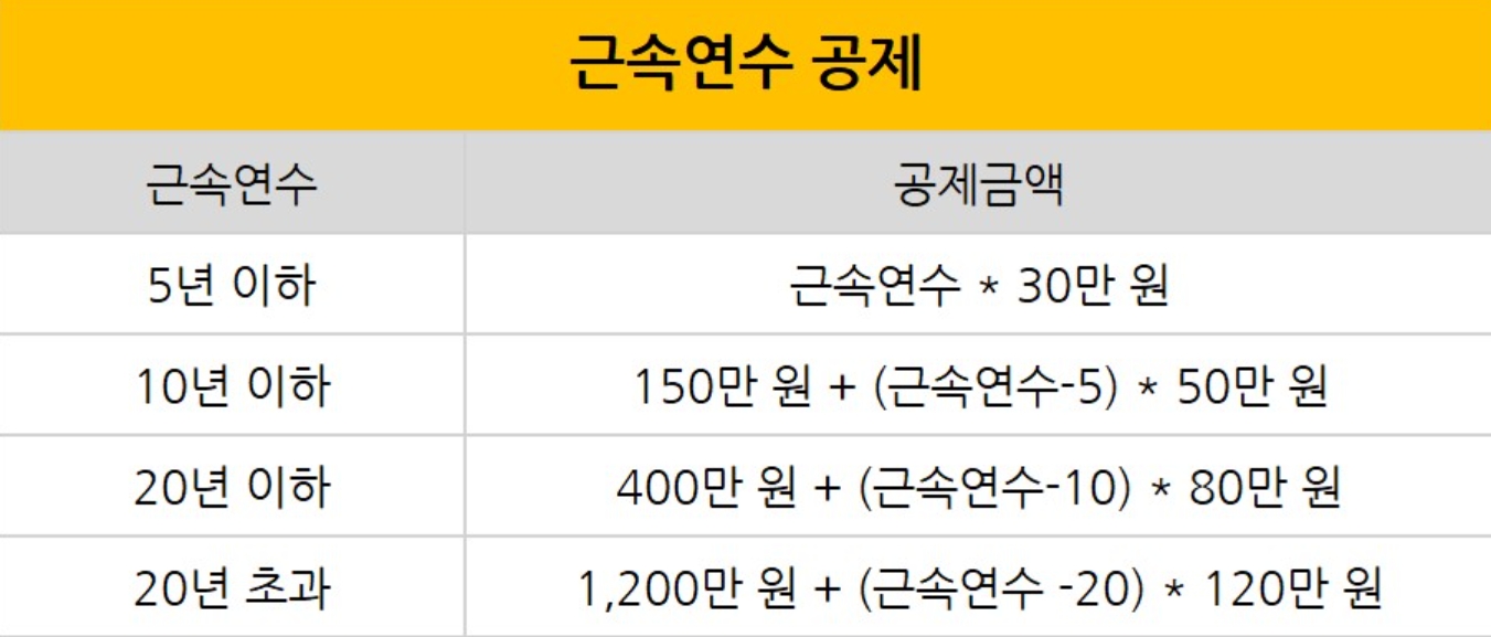 위 말씀드렸던 것처럼 오래 회사를 다녔을 경우 근속기간에 비례해 퇴직소득세를 공제해 줍니다. 이를 근속연수 공제라고 하며 아래 표를 참고하시어 내가 다닌 근속연수를 체크해 보고 공제금액을 확인해 봅니다.