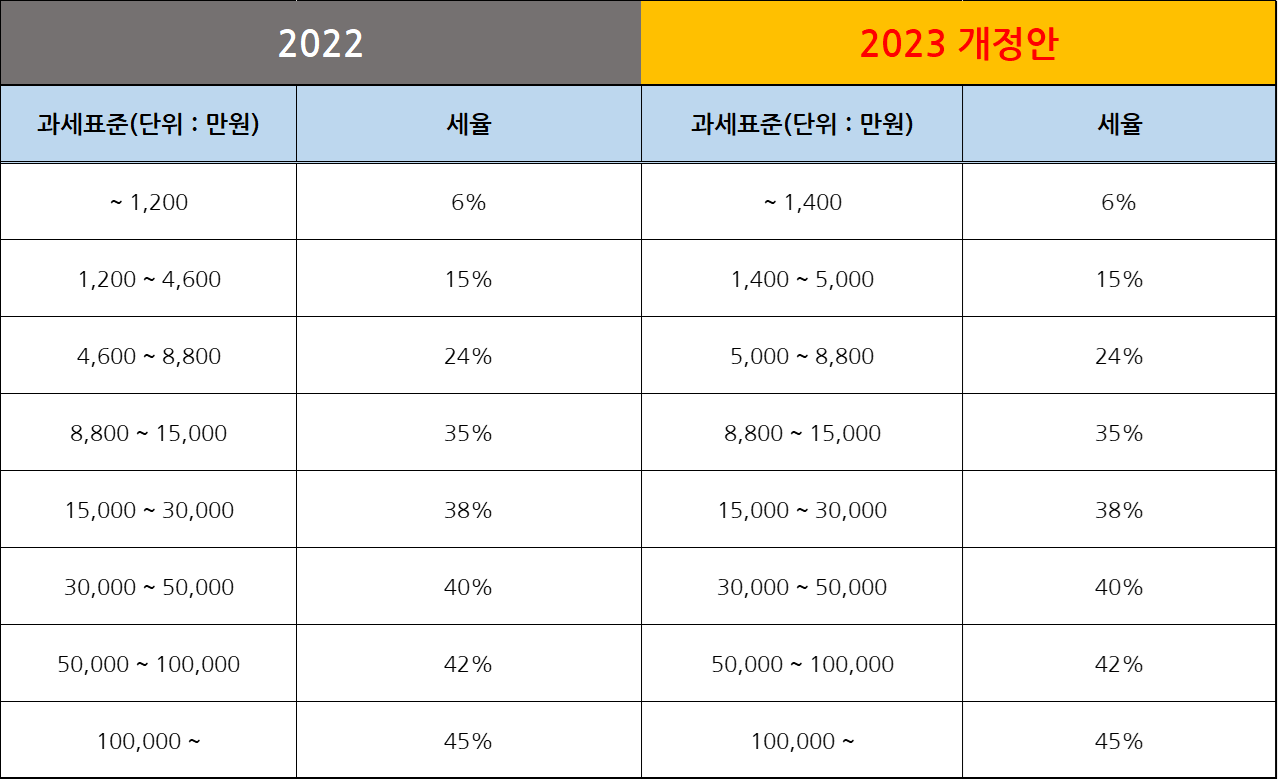 2022년에 비해 2023년 퇴직금 세율은 과세표준이 좀 더 완화되었습니다.