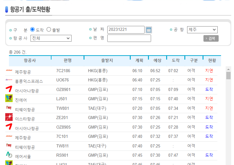 오늘 날짜, 그리고 공항부분을 아래 이미지처럼 제주로 변경하시어 검색 버튼을 클릭해보시기 바랍니다.