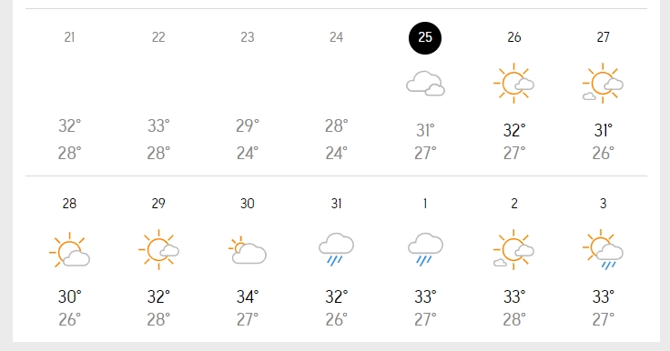 25일부터 31일까지 얼마 남지않았으나 쾌청한 날씨가 이어지겠습니다. 5월부터는 여름으로 생각하셔도 되기 때문에 한낮기온이 34도까지 오르기도 합니다.