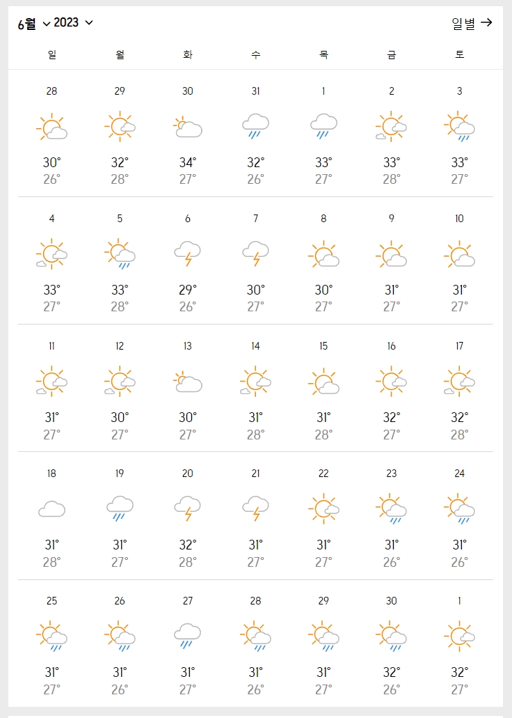 우기에 속하는 홍콩의 6월 날씨입니다. 주 1~2차례 소나기나 비를 동반하기 때문에 이 시기에 여행하시는 분들은 우산을 꼭 챙기셔야 겠습니다.