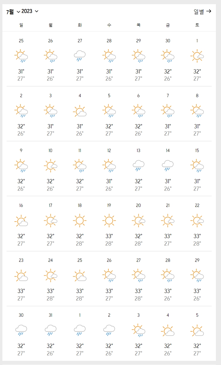6월보다는 비가 오는 일자가 많아지는 7월 날씨는 비 때문인지 한낮기온은 32도 가량으로 생각보다 높진않습니다. 다만 거의 20일 이상 비가 오기때문에 우비나 우산을 필수적으로 챙기셔야 겠습니다.