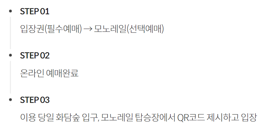 입장권 예매 하기를 클릭하시면 입장권을 필수로 예약, 그리고 모노레일을 선택하여 예매할 수 있는 페이지로 이동됩니다.