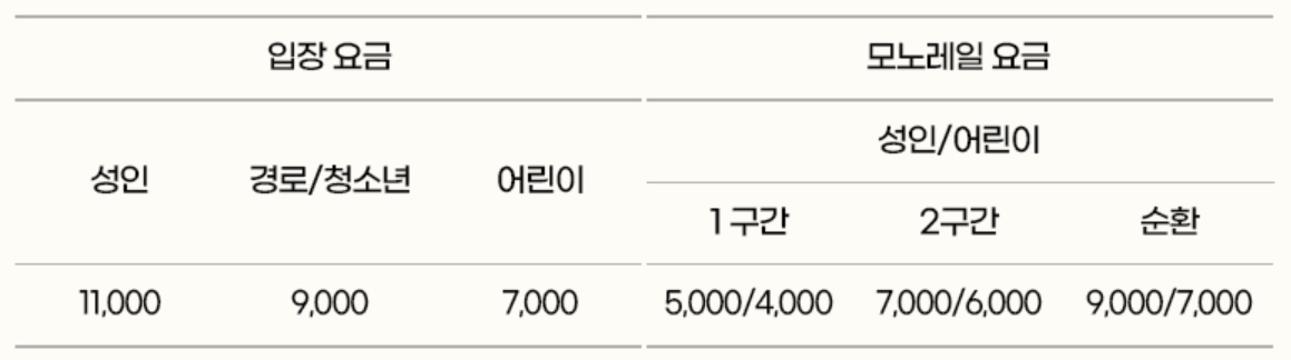 어느정도의 입장요금을 내야하는지 아래 표를 통해 확인해보시기 바랍니다.