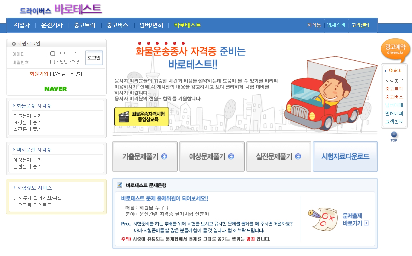 드라이버스 홈페이지에서는 화물운송종사 자격증 준비를 위해 기출문제와 예상문제, 실전문제 등을 풀이할 수 있도록 마련되어있습니다. 아래 버튼을 클릭하시면 드라이버스 바로테스트 홈페이지로 이동합니다.