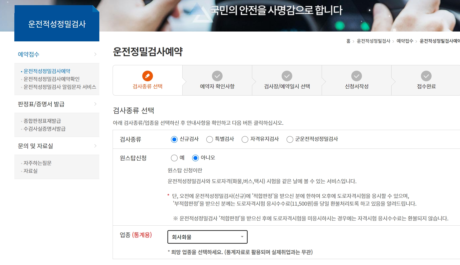 사업용 화물자동차를 운전하고자한다면 아래 링크를 통해 운전적성 정밀검사를 받아야 하는데요, 아래 이미지와 같이 회사화물인지 개인화물인지 체크 후 검사를 받습니다.