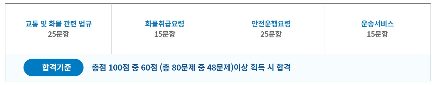화물운송 자격시험 과목은 교통 및 화물자동차 운수사업 관련 법규, 화물 취급 요령, 안전 운행, 운송서비스 등인데요 총점에서 60% 이상을 얻을경우 합격할 수 있습니다.