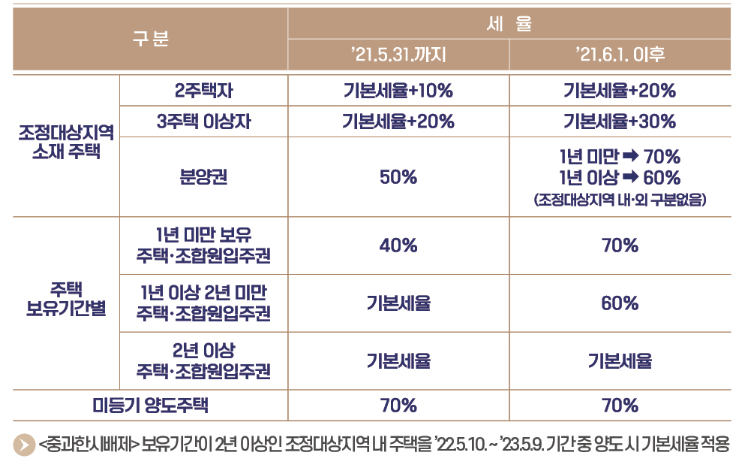 다만, 조정대상지역 내 보유기간이 2주택 이상일 경우에는 22년 5월 10일부터 23년 5월 9일까지 1년 중 양도할 경우 중과세 적용을 한시적으로 배제합니다.