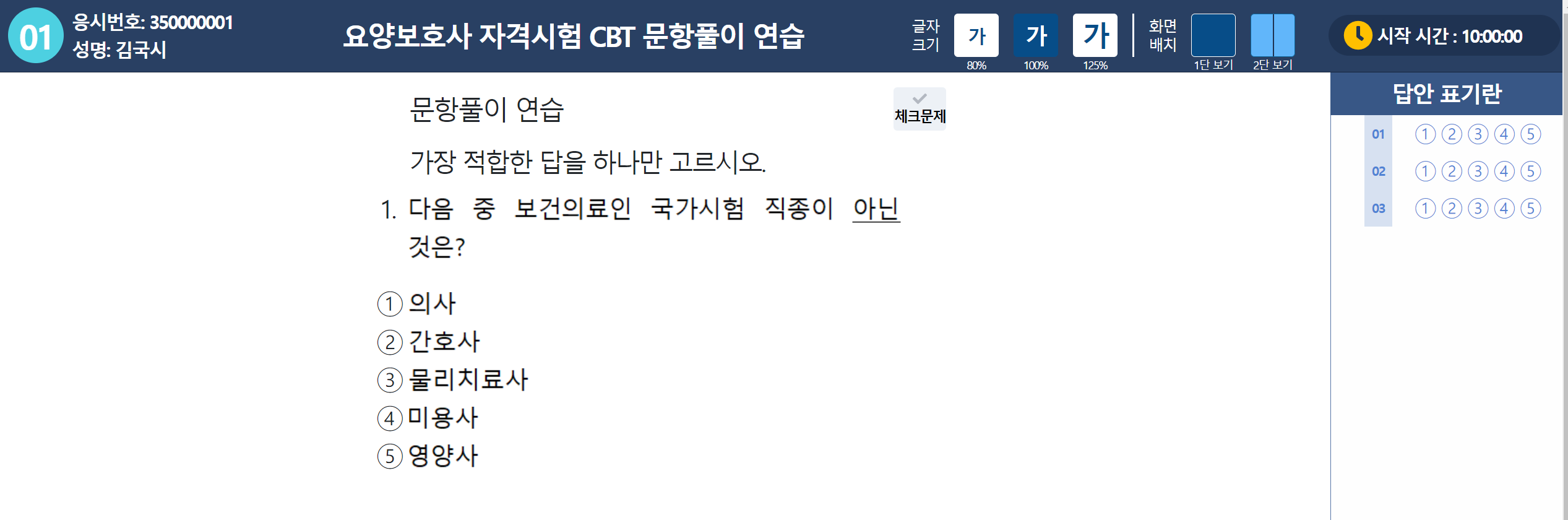 연결해놓은 사이트로 들어가시면 '요양보호사 CBT 체험하기'를 누릅니다. 그러면 아래와 같이 실제 시험에서 문항 풀이를 할 수 있는 것 처럼 연습해볼 수 있습니다. 다소 버튼이 많기 때문에 하단에 있는 '다음' 버튼을 통해 다음 문항으로 넘어갈 수 있습니다.
