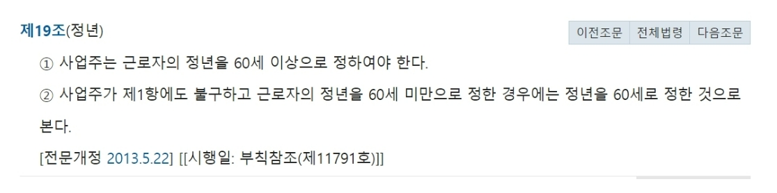 근로기준법 제 19조에 명시되어있는 정년퇴직 나이는 60세 입니다. 우리가 일자리를 구할 때 근로자의 정년을 60세 미만으로 정해놓은 근로계약은 모두 위반된 것으로 이의신청을 하셔도 되겠습니다.