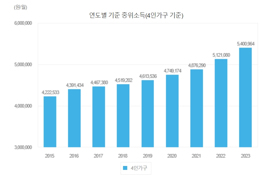 중위소득 지표는 연도별로 올라가고 있습니다. 15년부터 2023년의 중위소득은 5,400,964원으로 중간 소득에 해당하는 분들이 매월 저 정도금액을 월급으로 번다고 생각하시면 됩니다.