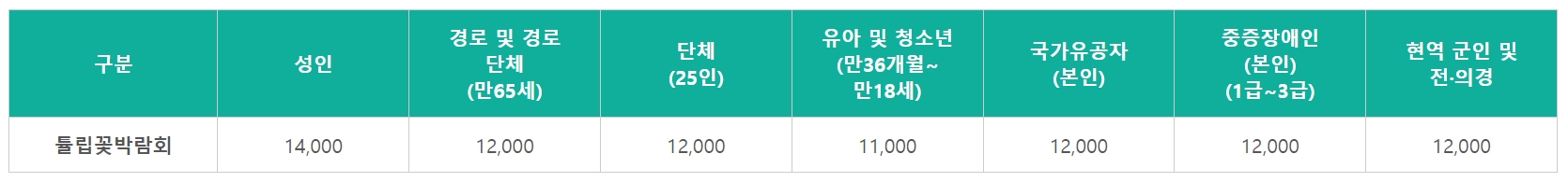 4월 12일부터 5월 7일 꽤 오랜 기간 진행되는 튤립 꽃 박람회는 9시부터 6시까지 입장이 가능하며, 오후 7에는 폐장 됩니다. 이용요금은 아래 표에서 확인해 보시기 바랍니다.