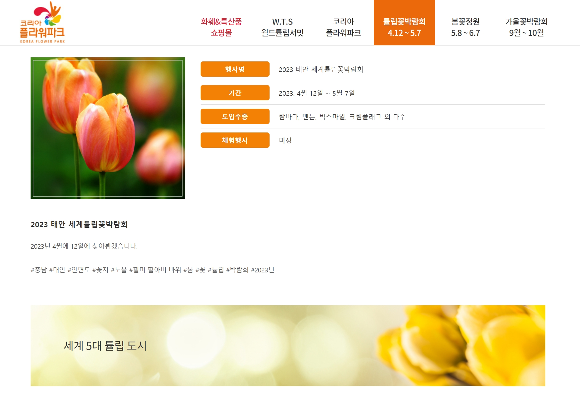 석양이 멋진 태안에서 개최되는 태안 튤립 꽃 박람회 소식입니다. 람바다, 멘톤, 빅스마일, 크림플래그 등 다수 종의 튤립을 만나보실 수 있는데요, 태안 세계튤립 꽃 박람회의 명성은 사실 예전부터 유명했습니다.