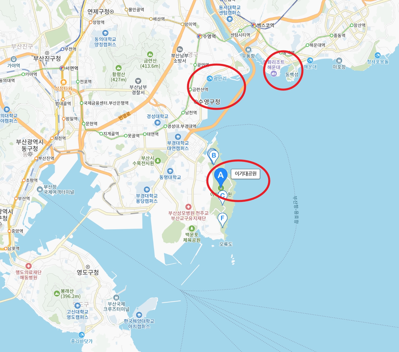 광안리 해수욕장, 동백섬, 이기대 3곳 명당자리에서 불꽃쇼를 감상하게 되는데요 3곳의 장소는 아래와 같습니다. 매년 불꽃축제 명당자리는 광안리 해수욕장인데요 해수욕장이 매우 크다고해도 그 곳을 메울만큼 사람들이 매우 붐비게 됩니다.
