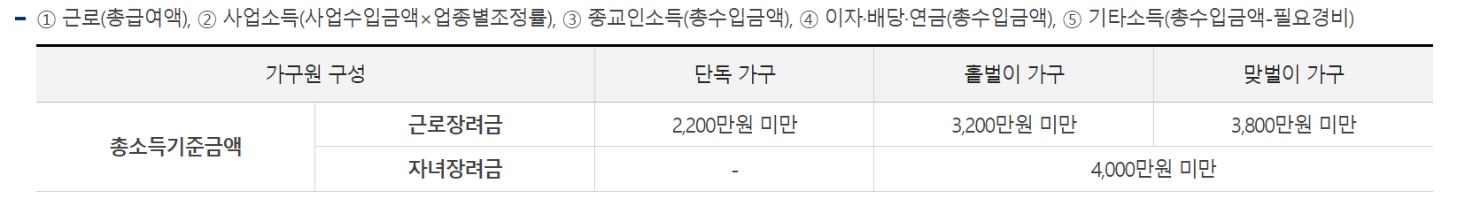가구유형에 다르므로 아래 표를 확인할 수 있습니다. 또한 여기에서 말하는 소득요건 총액은 영업소득이나 근로소득뿐만 아니라 종교소득이나 배당금, 이자, 연금 등도 포함됩니다.
