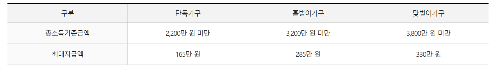 혼자 사는 독신일 경우 총소득이 2,200만 원 이하일 때, 외벌이는 3,200만 원 미만일 때, 맞벌이 부부는 3,800만 원 이하일 때 신청하실 수 있습니다.