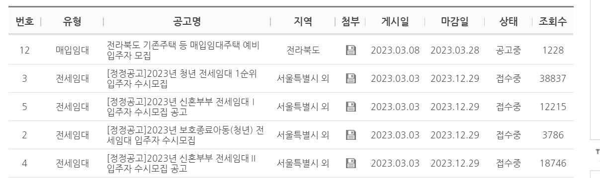 현재 공고중인 유형의 임대 아파트를 보시면, 아래 이미지처럼 청년 전세임대, 신혼부부 전세임대 등 유형별로 공고가 올라옵니다.