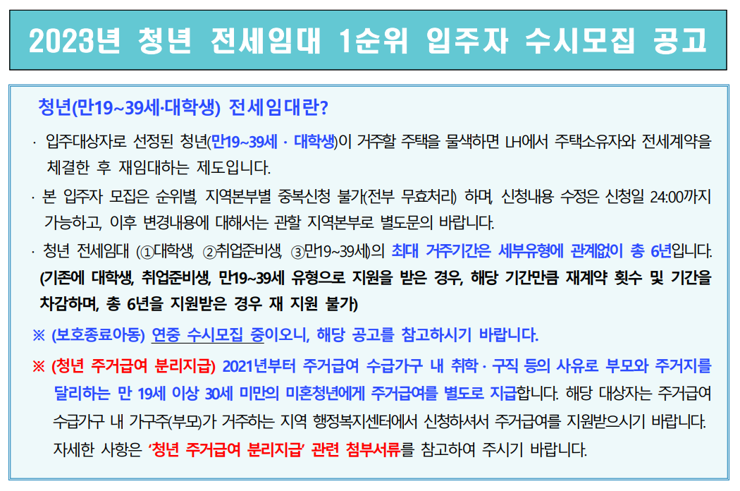수시로 모집하는 청년 대상의 전세임대 내용으로 해당 공고문은 각 유형에 따라 신청 페이지로 들어가면 모두 확인하실 수 있습니다. 거주기간은 2년에서 6년까지 다양합니다.