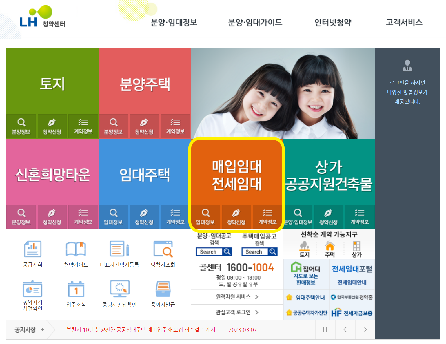 LH 청약센터 홈페이지에서 확인하실 수 있습니다. 공고 내용을 확인하는 것은 별도 인증서 필요 없이 확인하실 수 있습니다. 다만 신청하실 때는 인증서 지참 후 메인페이지에서 노란색 박스 부분을 클릭해 주시면 되겠습니다.