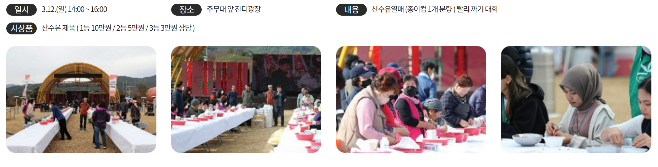 3월 12일 오후 2시부터 4시까지는 잔디광장에서 산수유 열매 까기 대회가 열립니다. 10만 원 상당의 산수유 제품이 제공된다고 하니 이 대회에 참가하고 싶으신 분들은 12일에 방문하시면 좋을 것 같습니다.