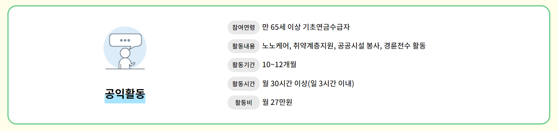 공익 활동은 만 65세 이상 기초연금 수급자라면 신청해 볼 수 있습니다. 월 30시간 이상 일할 수는 있지만 하루에 3시간 안쪽으로만 근무할 수 있습니다.