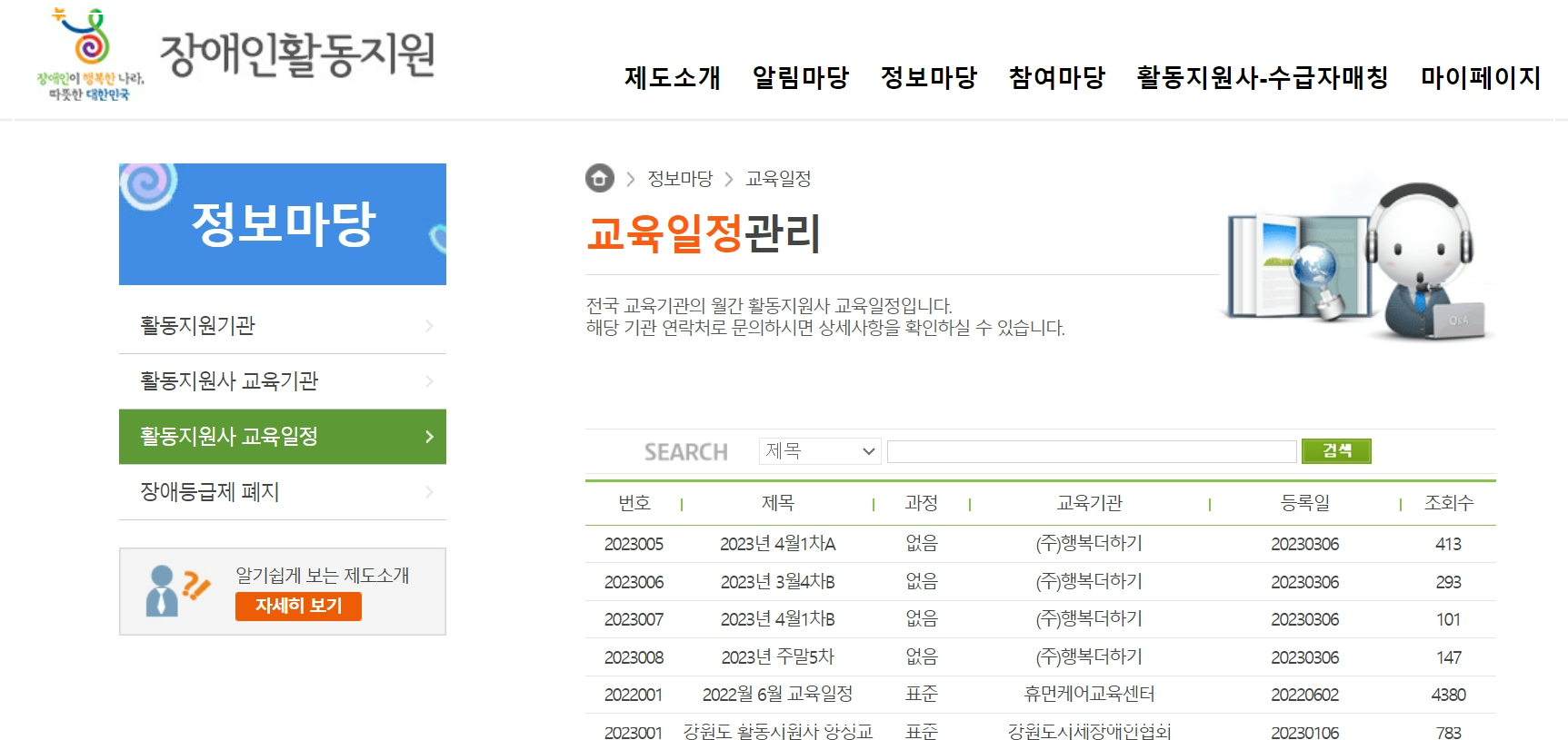 매월 진행되는 교육이 선착순으로 마감될 수 있어 되도록이면 미리 즐겨찾기 해놓으시고 체크해 놓으셨다가 장애인 활동지원사 교육을 받아보시는 것을 권장드립니다.